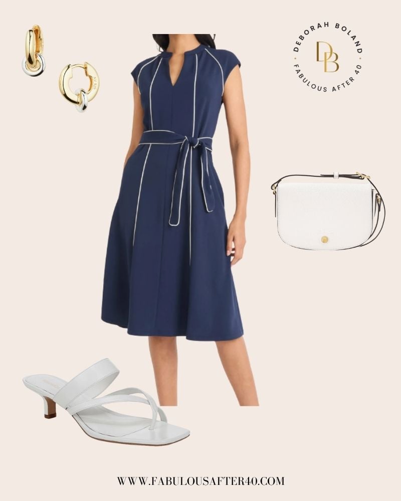 The pretty white contrast piping keeps this dress looking fresh and feminine, and the easy-to-wear tie belt gives you an hourglass shape. Just add white sandals and a bag to accentuate the piping and make your dress stand out.