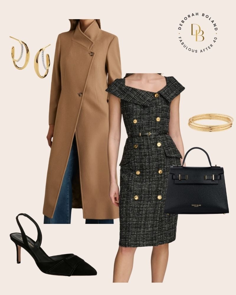 Wear this with a rich camel coat, a black bag, and shoes, and add some fabulous bling to match the double row of buttons down the front. This feels like movie star glam.