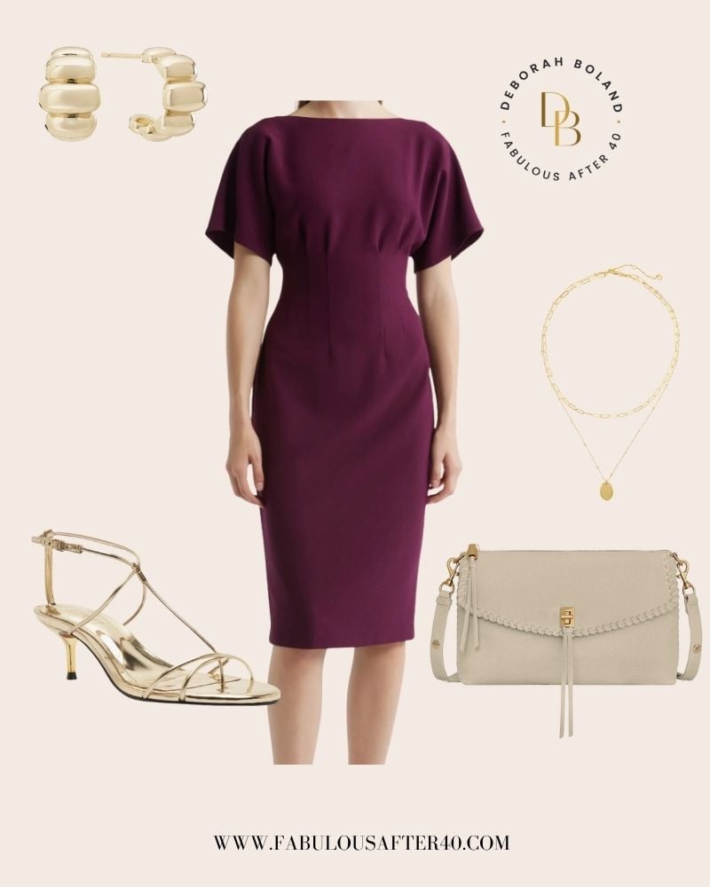 Here’s a gorgeous dress that highlights your curves, or creates a few if you don’t have any! It’s a simple sheath style with a slimming, corset-like middle that helps whittle your waist and flatten your stomach. It’s tailored, polished, and ladylike, and in this stunning plum color, or the warm navy it also comes in, it is one gorgeous dress.