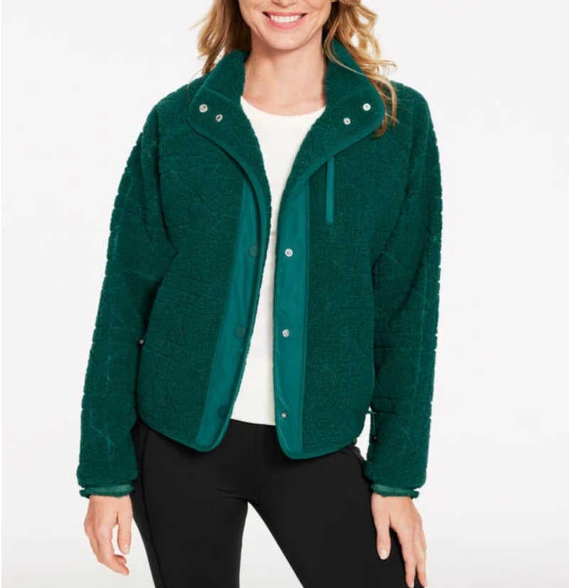 This green sherpa jacket nails that sporty-meets-polished vibe. The embossed texture makes it feel more expensive than a typical sherpa piece, and the contrast trim keeps the shape clean and modern. The mock neck adds warmth, the zip pockets are practical, and the above-hip length is flattering on everyone.