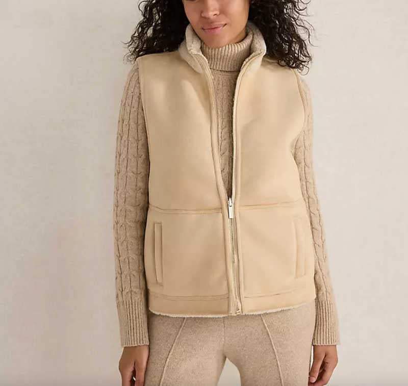 If you run warm or live in a milder climate, a reversible sherpa vest is a smart layering piece. Fluffy sherpa on one side, smooth suede on the other — two looks in one. Easy to style with joggers, denim, or athleisure.
