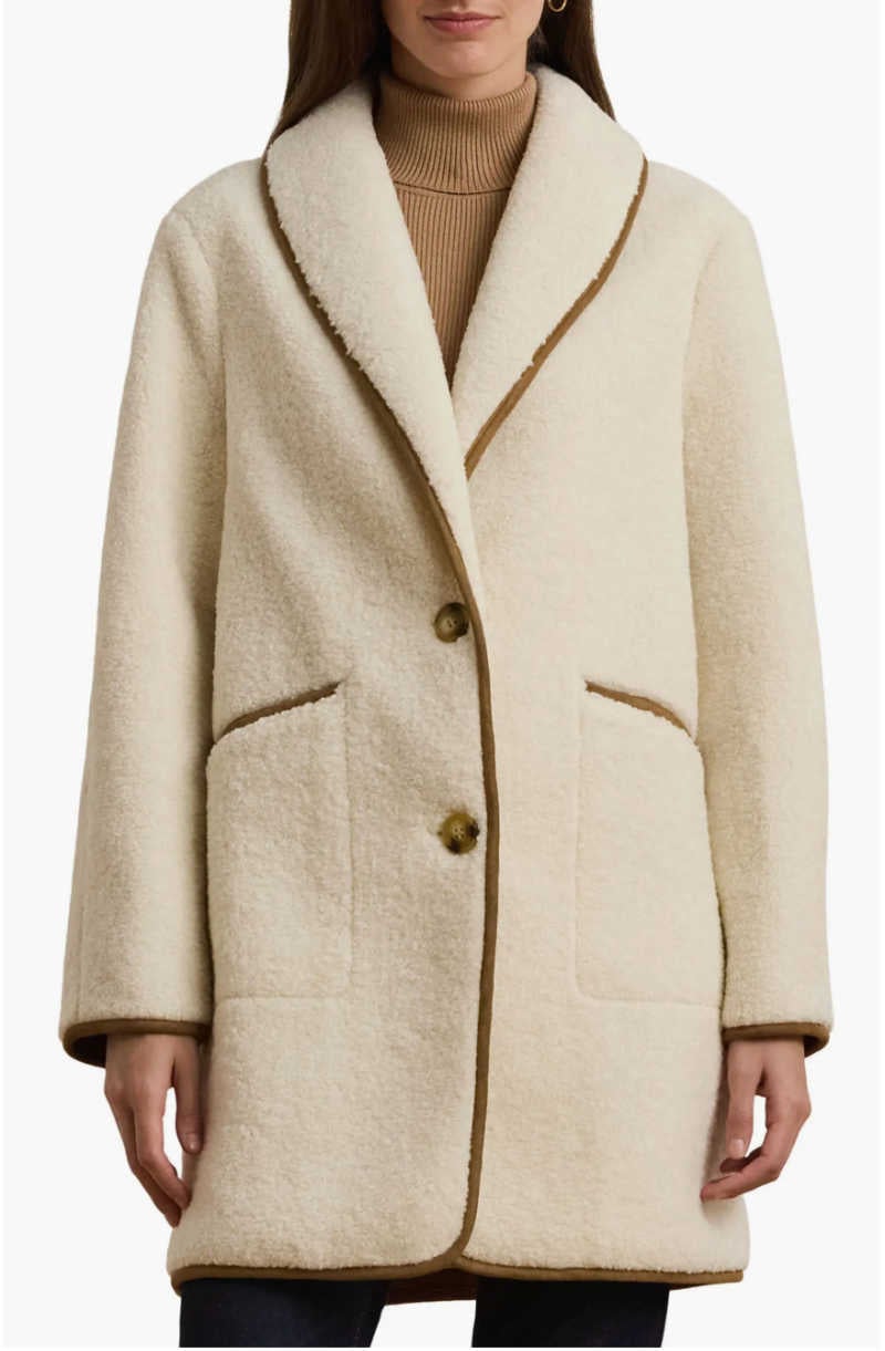 This Ralph Lauren sherpa jacket blends creamy sherpa with brown faux-suede trim for a classy, elevated look. The shawl collar frames the face beautifully, and the shape is relaxed without looking sloppy. A great “everyday winter” jacket that still feels special.