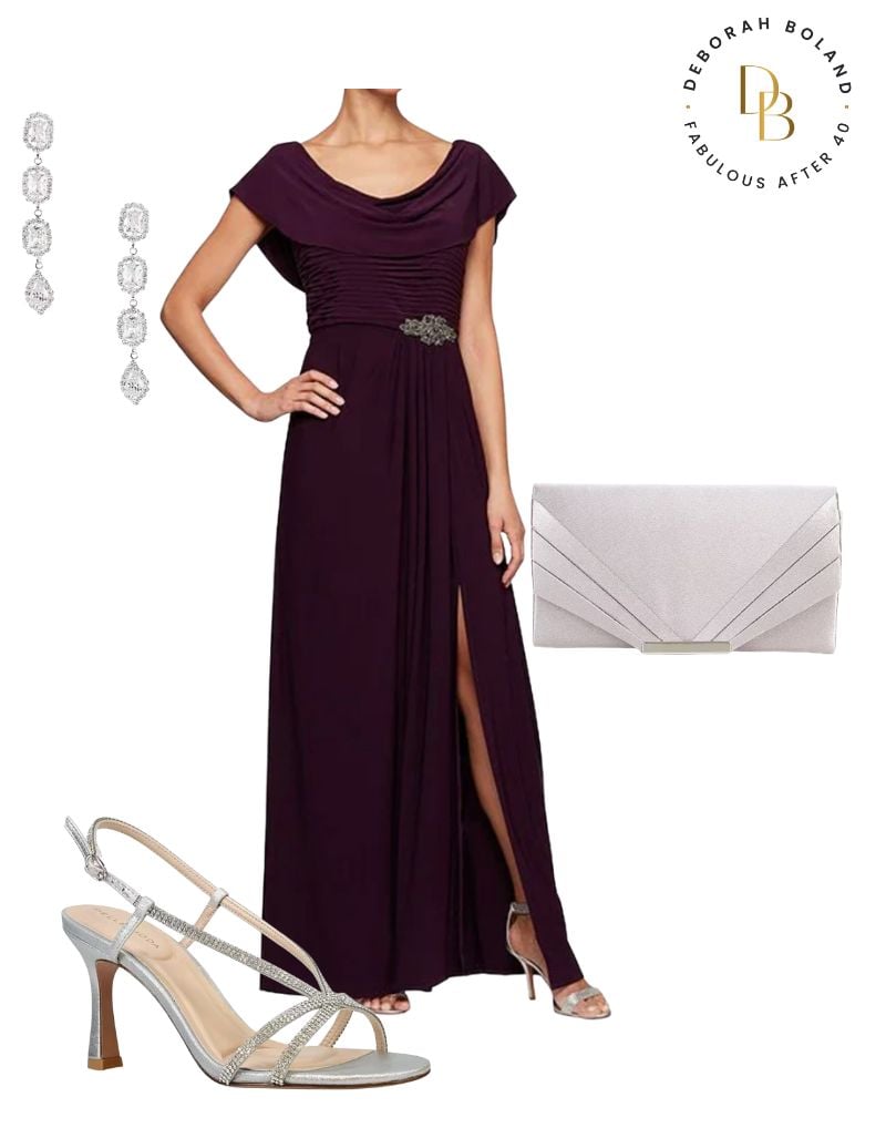 The cowl neck and embellished waist on this gorgeous eggplant gown make it a fashion-forward choice that will particularly appeal to a mother of the bride or groom with a more modern style sensibility. The neckline is a real head-turner!