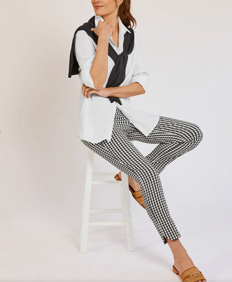 For example, these slim, cropped, black-and-whiteite gingham ankle pants. They have a clean, minimalistic, elegant cut. The vibe is tailored but not stiff, and the styling is spot-on. Instead of pairing these pants with something precious—like a puff-sleeved blouse—they kept it very crisp and sporty with a button-down shirt and a sweater casually knotted over the shoulders. Nothing busy or cutesy. Just simple, classic, and effortless.