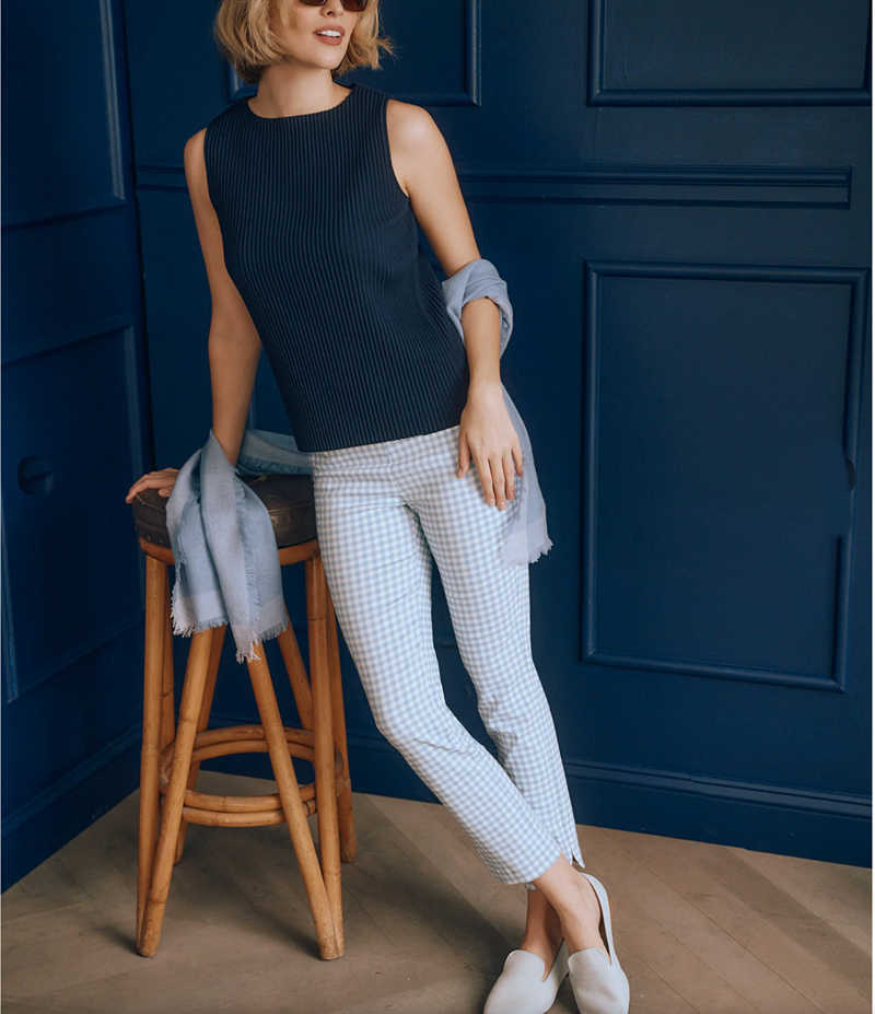 I also love this styling idea. They’ve taken these same gingham pants, but in light blue, and paired them with a simple knit top. I like how the ribbing adds such a beautiful texture, and the sleeveless design makes the outfit feel very modern and youthful. I’d wear this or the black and white pants with the long white shirt in a heartbeat!