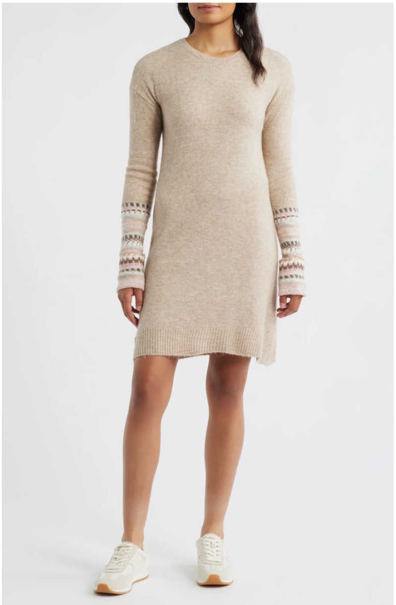 If you love comfort but still want to look current, style your sweater dress with sneakers for a modern look. White leather sneakers are the easiest way to give your dress a cool, off-duty vibe. Add a crossbody bag and gold hoops, and you’ve nailed that casual, weekend-chic look.