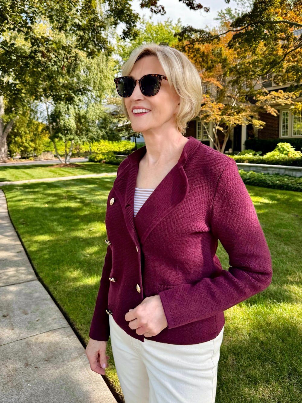 I recently found a beautiful style at Talbots, and it’s an outfit-lifter. It’s soft, cozy, and easy to move in, but it still gives you that little bit of structure that makes any outfit feel finished, and the gold buttons add polish. It’s cozy without being sloppy, and structured without being stiff—exactly what we want for real life after 50.