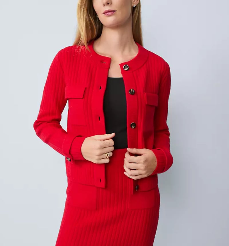 Here’s a gorgeous work or going out sweater jacket. Ribbing adds vertical lines for a slimming effect. Works beautifully as a set with a matching skirt or over black pants for holiday dinners and events. I adore this red!