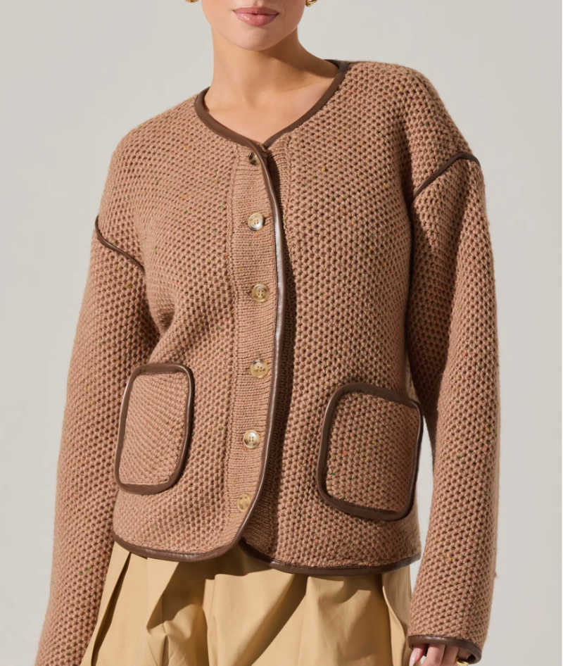 The chunky stitch texture is artsy and modern. I’m also loving the faux leather contrast edging that frames and the youthful details like those big patch pockets. Beautiful with camel, or brown pants, or wear it open with dark denim and a simple fitted tee underneath.