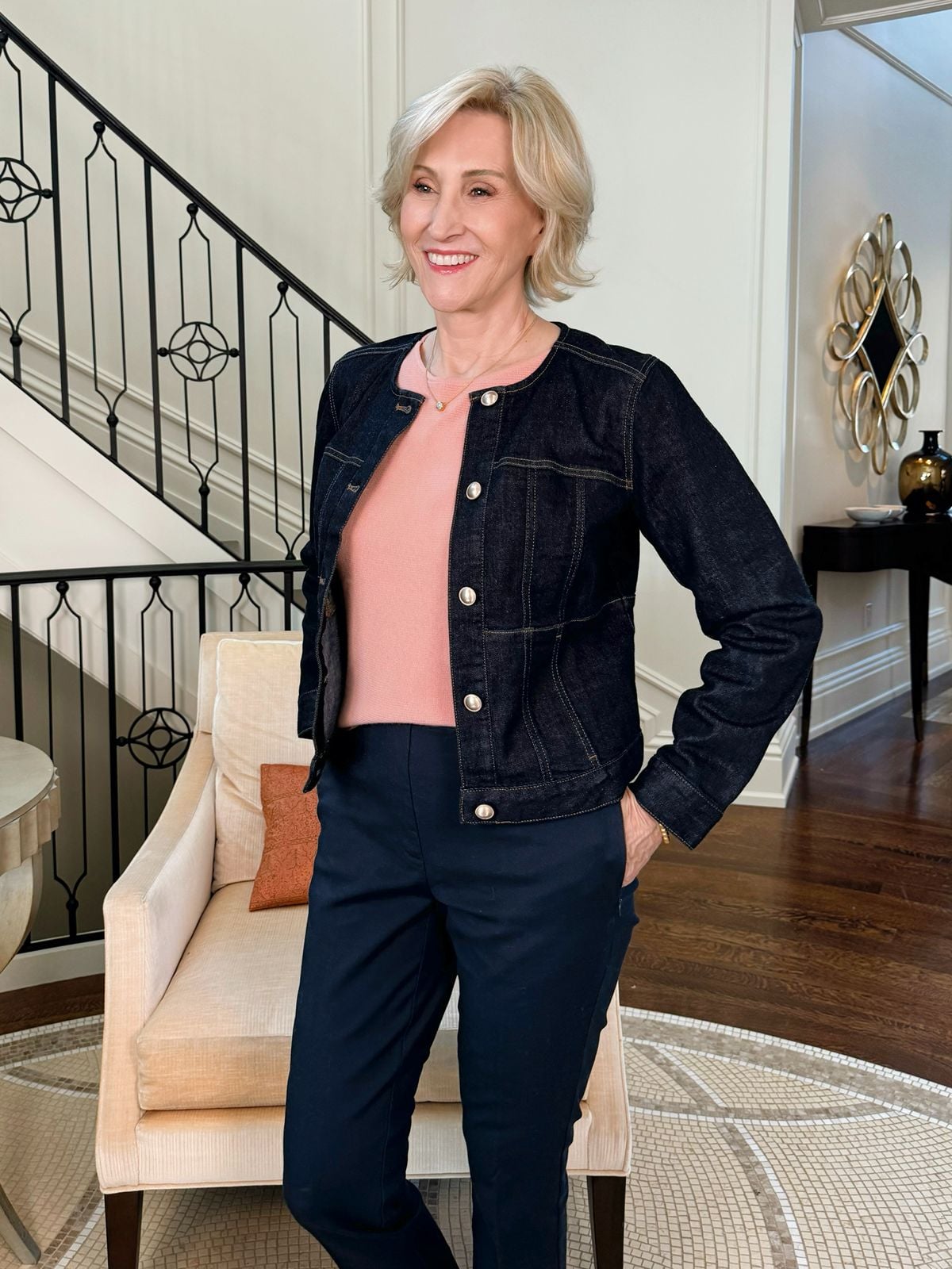 This collarless denim jacket feels cleaner and more updated than a traditional jean jacket. I love how it frames the face and gives the whole outfit a sleek, tailored vibe.