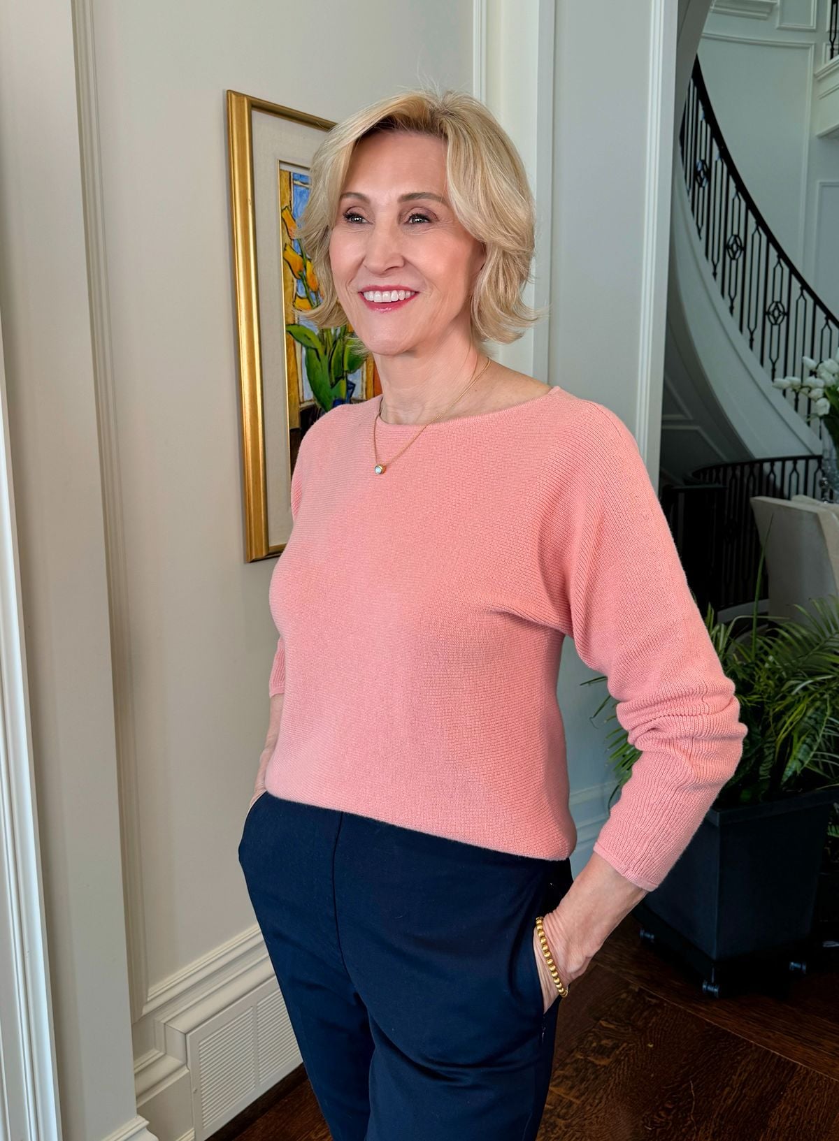 This fine textured sweater is such a pretty way to bring color back into your wardrobe without going bold. The soft peachy tone brightens everything up, especially with navy pants.