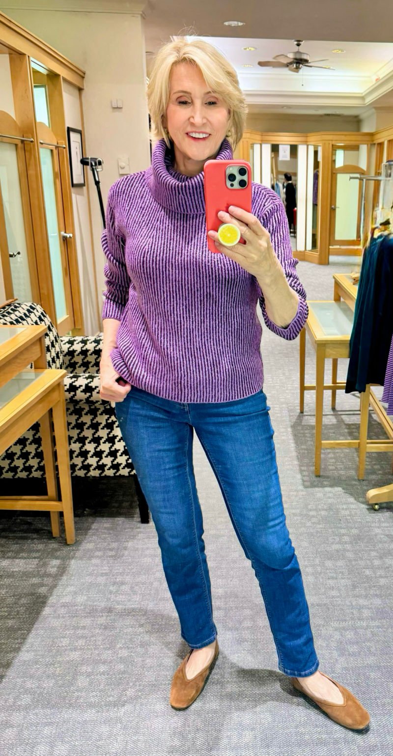 This boxy, ribbed turtleneck was the first thing I tried on, and I loved it. You wouldn’t believe how incredibly soft it is, and the two-tone purple stripes make it work for both cool and warm complexions, like mine. The neck is high, but it sits away from the face, so you have plenty of breathing room!