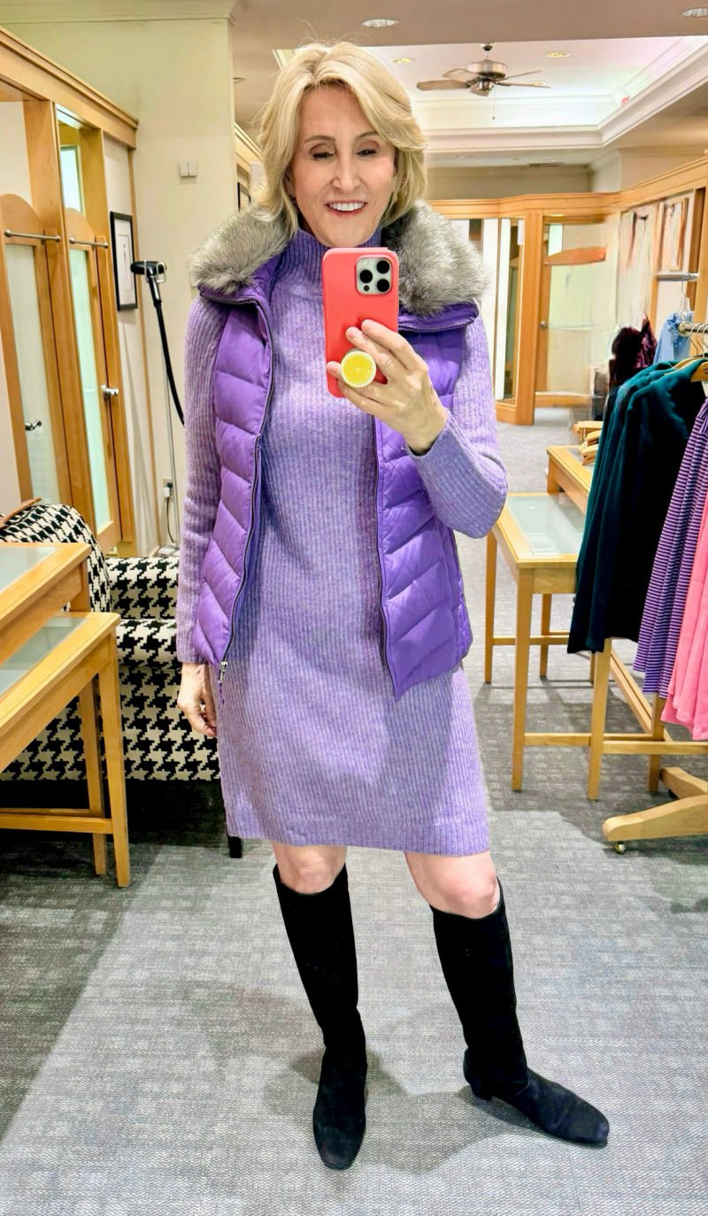 This heather sweater dress is a beauty on its own, but when you layer it with a faux-fur-trimmed puffer vest, you have a fabulous fall look with a fun après-ski vibe. It’s super cute – wintry, but not heavy-looking. I loved this!