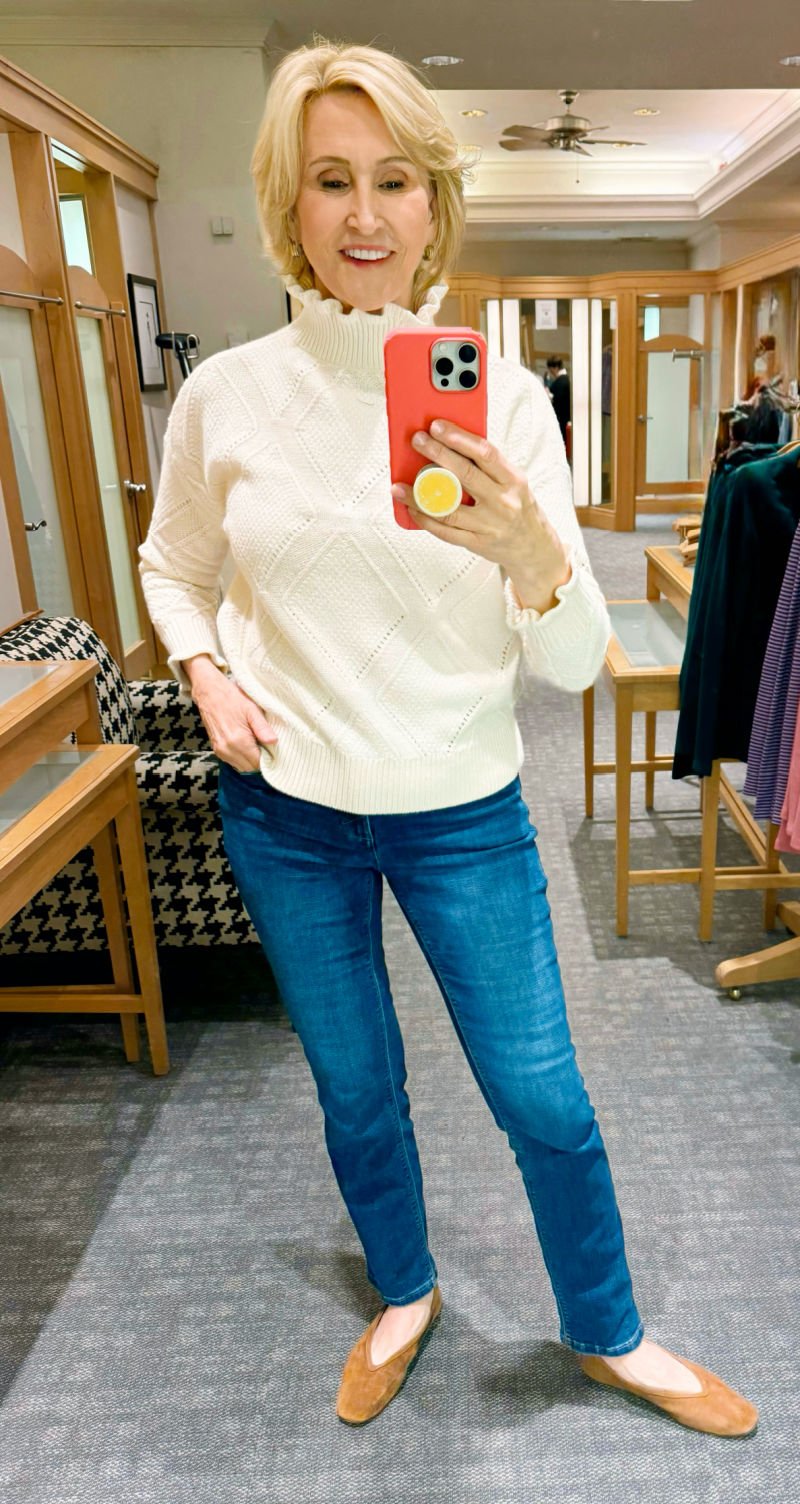 Here’s an interesting sweater that made me feel like an Elizabethan queen! It’s a diamond-patterned turtleneck with a fancy, feminine ruffle collar. It looks special, like something you’d definitely want to wear over the holidays. And you don’t even have to wear it with dress pants. It’s darling with just plain old jeans.