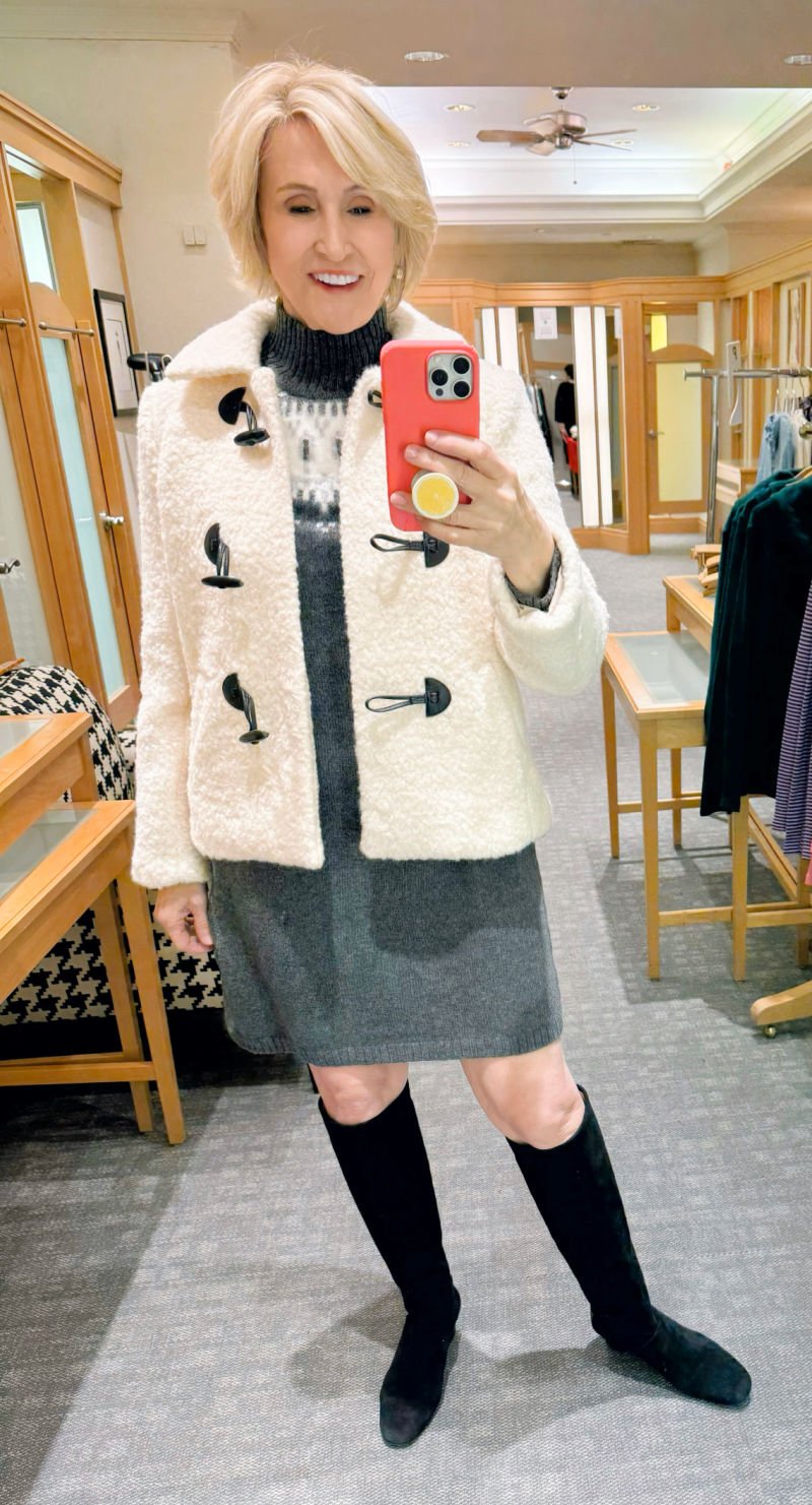 I thought I’d give you one last look at this cute sherpa jacket. Although I didn’t end up buying the gray sweaterdress (I wasn’t sure I’d get enough use out of it), I thought it looked amazing with this jacket. This is not just a dress, jacket, and boots.