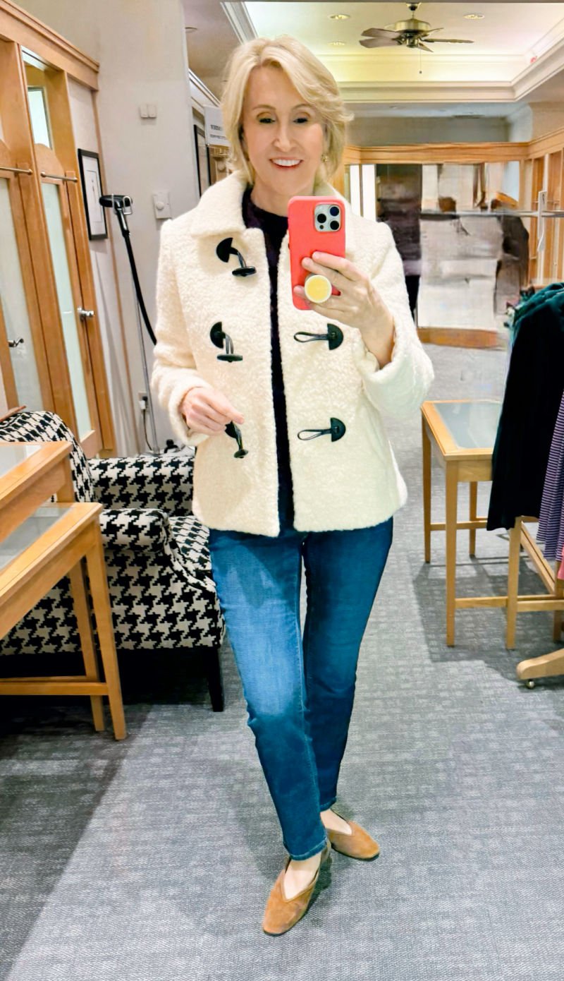 Do you ever see something and think it is so “dolly” that you can’t resist? I was curious to try this cozy sherpa jacket and was surprised by how much I loved it.