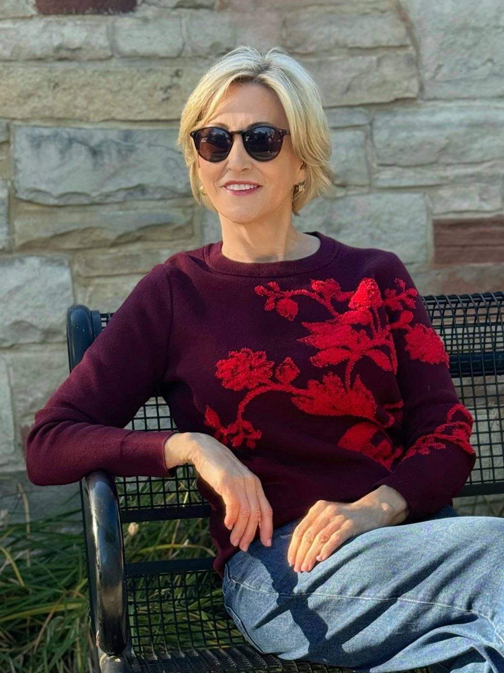 Here it is. A classic floral sweatshirt that is pretty and timeless. I don’t wear many prints, but when I see a good one like this, I snap it up. This is a super comfortable top that I’ve been wearing a lot. And it looks great with these Talbots straight-leg jeans – the style that suits everyone and is so on-trend right now. Love the suede bag and shoes. They’re not from Talbots, but I’ll link them too. :)