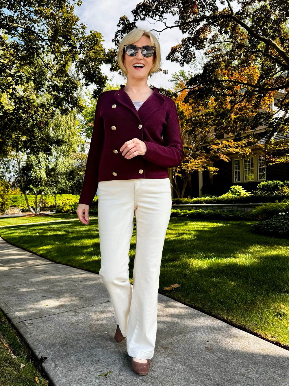 Here’s another pair of wide-leg pants that I shared earlier in September. They’re still in stock! In addition to all Talbots’ great sweaters and jackets, they also have Sweater jackets! Yes, both combined into one, and I think it’s a great idea. I don’t always want a formal coat or a super soft sweater. This double-breasted burgundy sweater jacket is the best of both worlds, and you can wear it done up, partly undone, or totally undone with a top or this striped tank underneath.